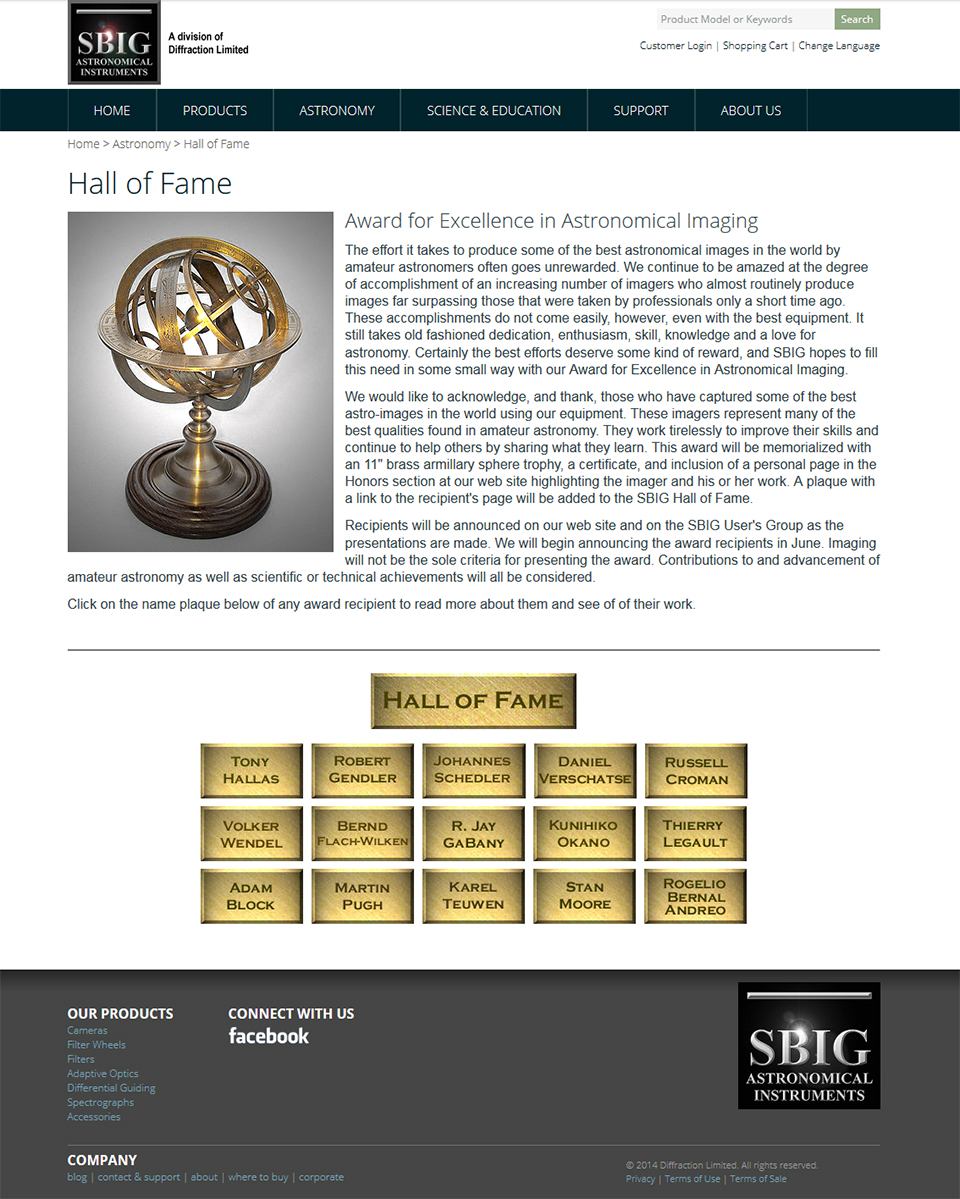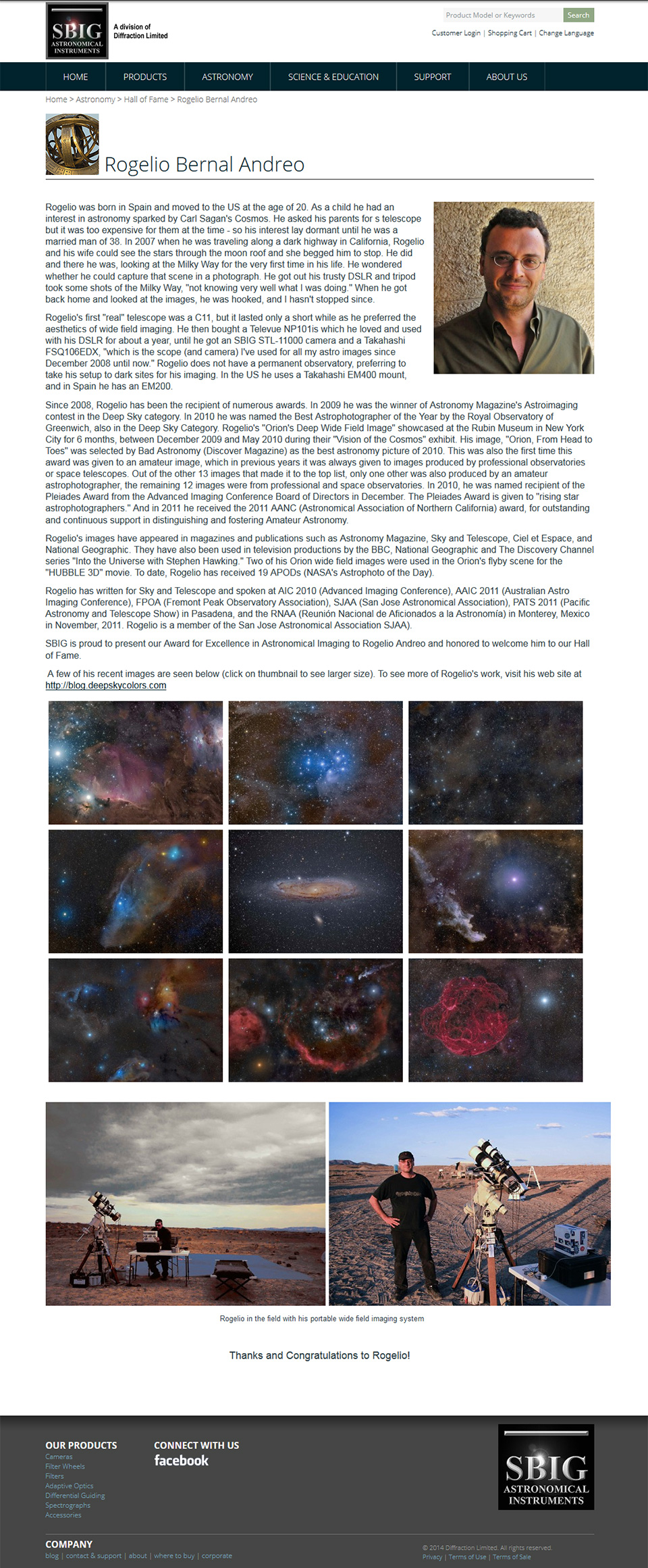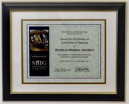 - Was added to SBIGs Hall of Fame (the original page was removed as SBIG moved to Diffraction Limited’s website) and received SBIG’s Award for Excellence in Astronomical Imaging in 2011. SBIG has described their Hall of Fame to be a recognition given to imagers who push the envelope in amateur astronomy.