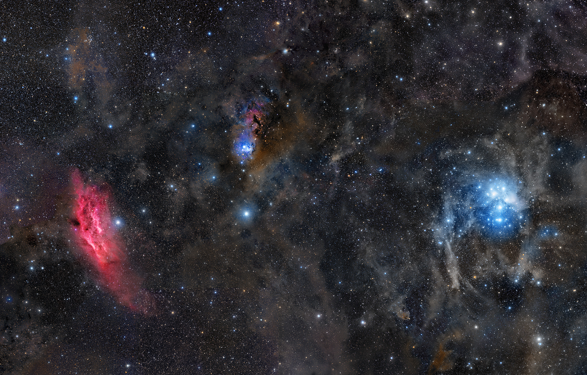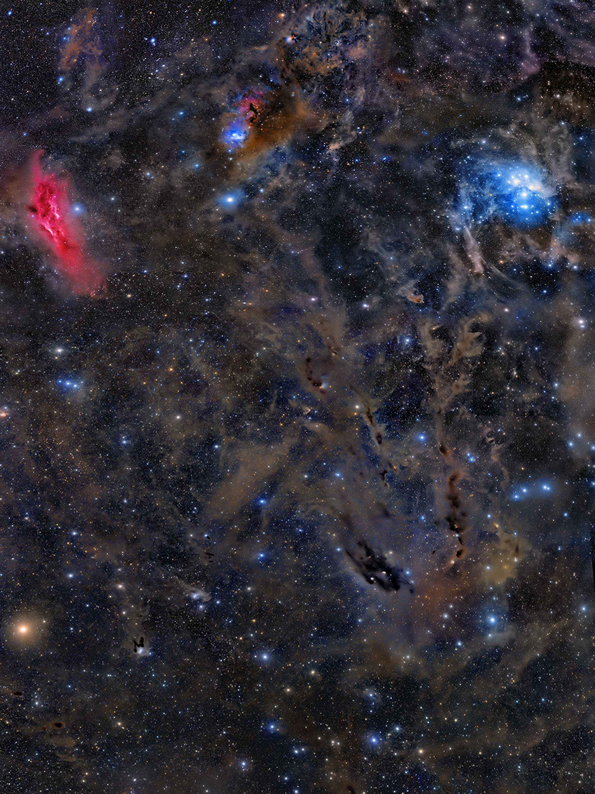 Clouds of Taurus, the first, and still the only image I know at telescopic resolution and depth that shows in nearly its entirety, the Taurus Molecular cloud, extending from the California nebula and the Pleiades to Simeis 147 and more.