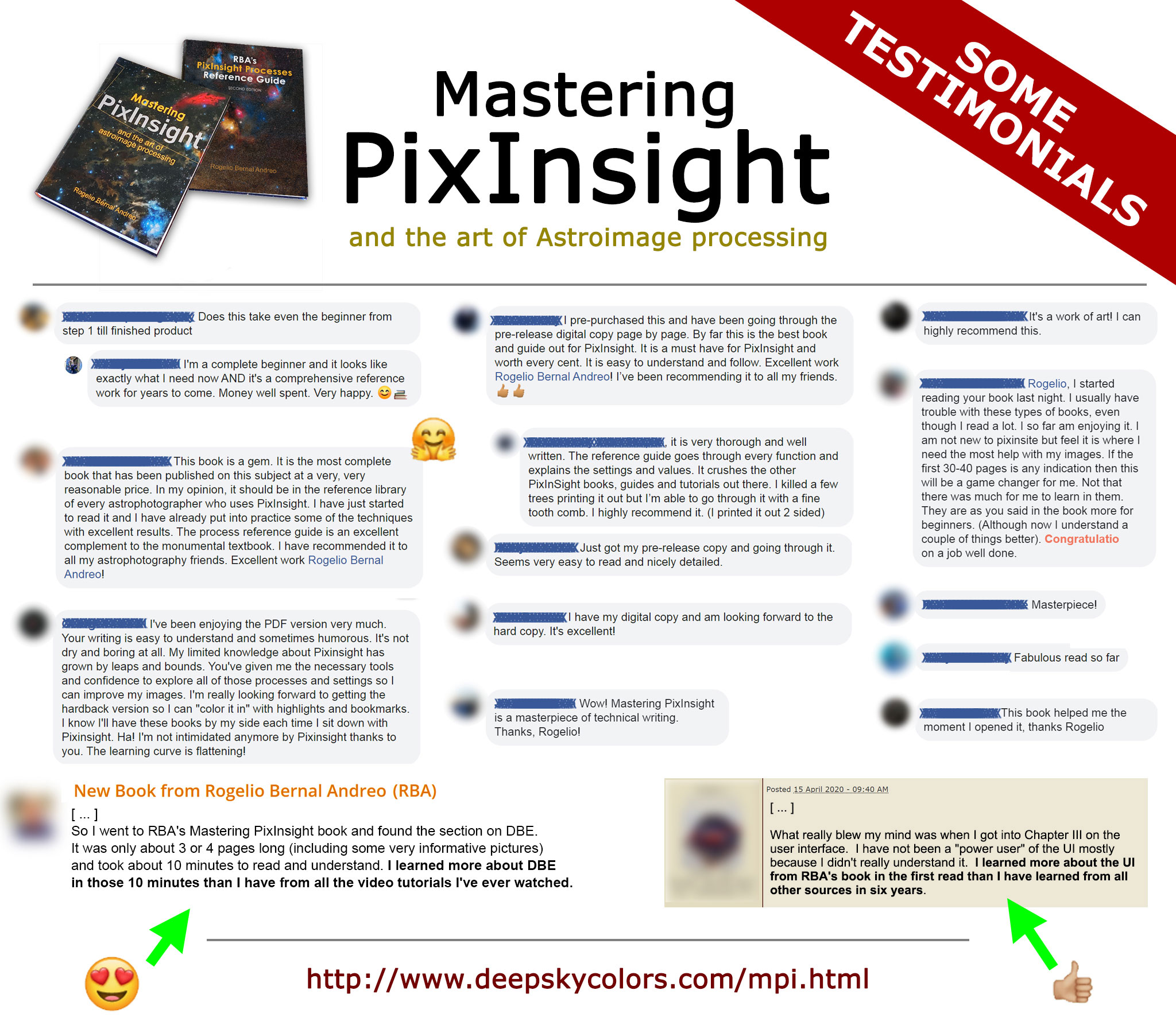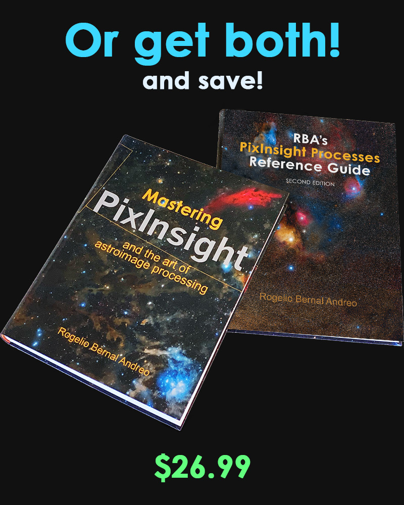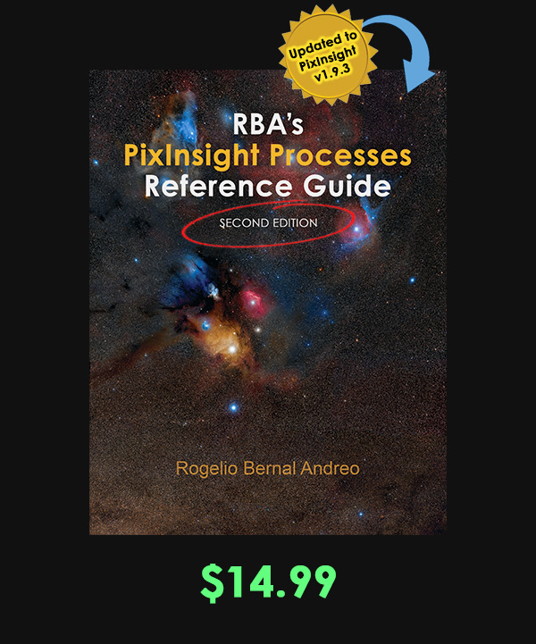 “Mastering PixInsight” does much more than covering PixInsight from A to Z. In addition to including the most complete PixInsight Reference Guide on the planet to date, the book takes an intimate look at RBA’s huge private repository of countless personal processing tips, “tricks”, methods and know-how accrued over more than ten years.