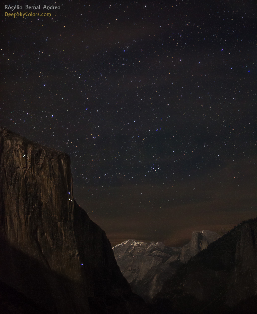 On the huge granite walls of El Capitan you can see four different “big white dots”… These are the lights from climbers taking on the 3000 feet vertical climb of El Capitan at night.