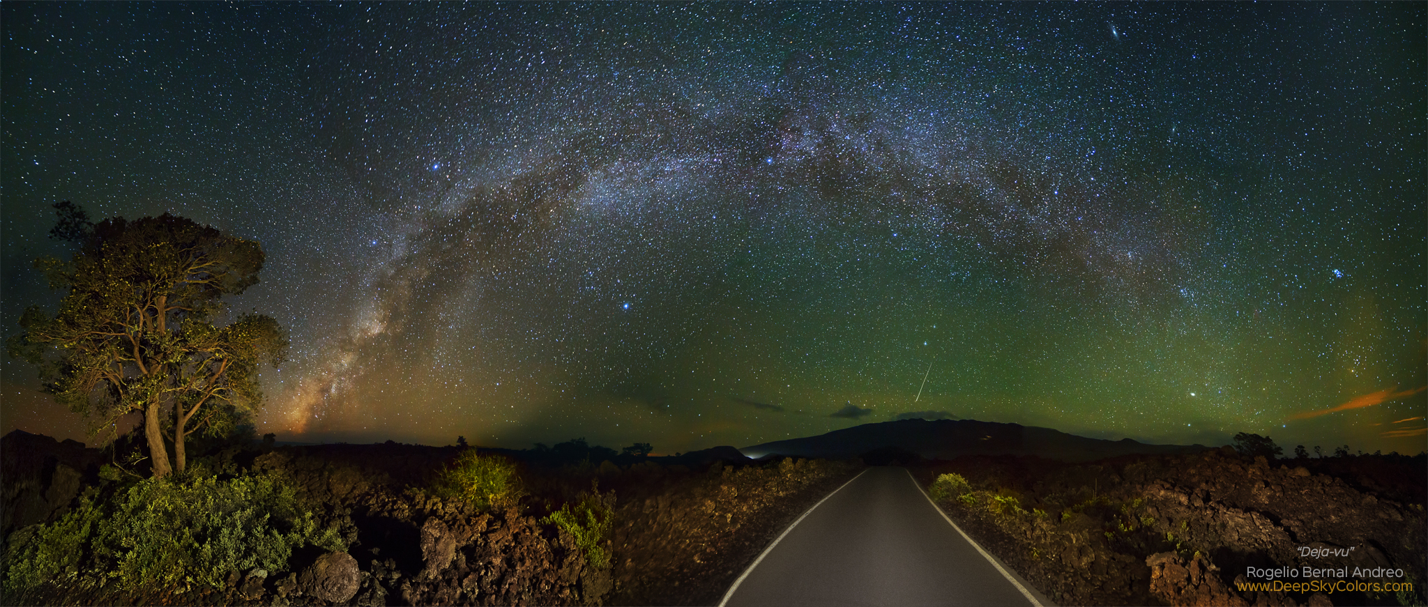 Mauna Loa road, Hawai’i. Mauna Kea in the distance, plus a bright meteor