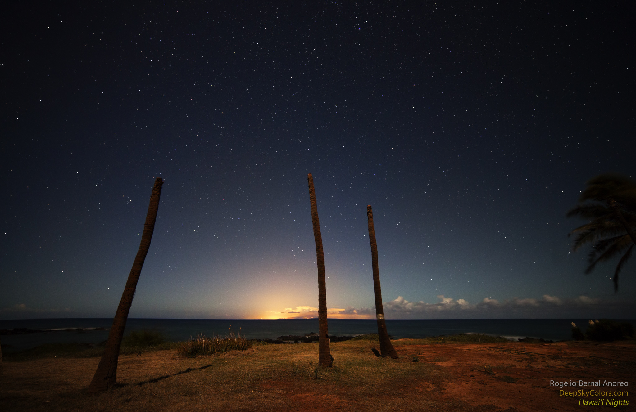 There’s a place in Moloka’i that in the past was the hideout of thieves and other outlaws. Some say the place is haunted and that the ghosts of those outlaws never left… Some others say you can still hear voices of children from better times…Others simply feel it’s an unfortunate place, cornered in an island that otherwise is a dreamlandMore recent events (it would take a while to narrate here) led to the owners of the land beheading hundreds of palm trees – something that according to ancient Polynesian traditions is a declaration of war – abandoning the area and then fleeing the island… The place then became abandoned to its own luck.The image I show you here is one of the many photos I took when I visited this area one night under the moonlight. It’s actually a fairly comfortable view of three of those poor decapitated trees and the lights from Oahu (Honolulu) in the horizon. Now…if you think this view it’s kind of sad, what you’d see if you turned around is something that left me speechless.