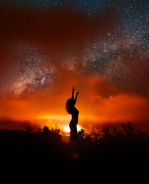Woman in front of lava glow from the Kilauea volcano, Hawai’i Volcanoes National Park, Big Island, Hawai’i