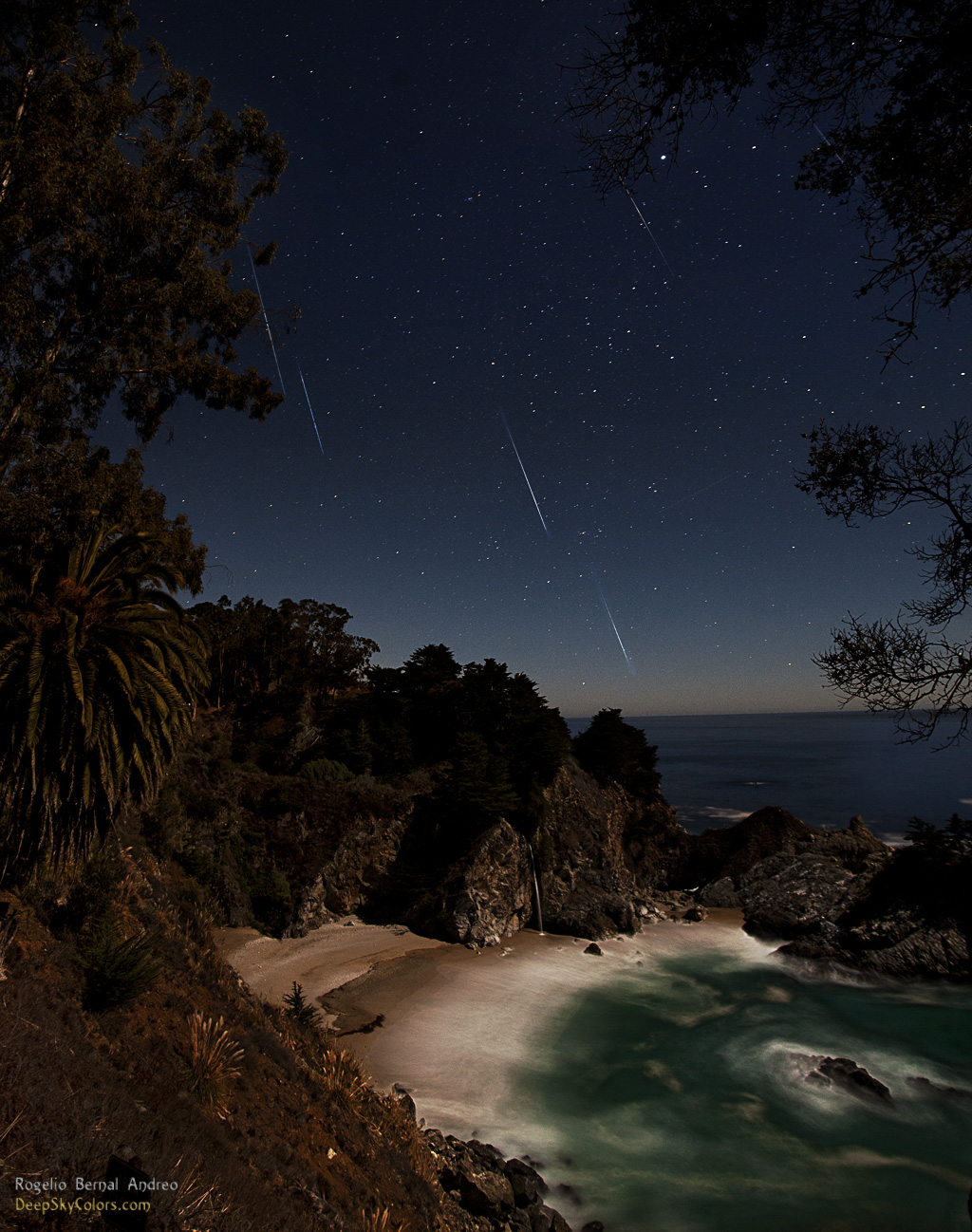 Geminid meteor shower over McWay Falls, Big Sur, California