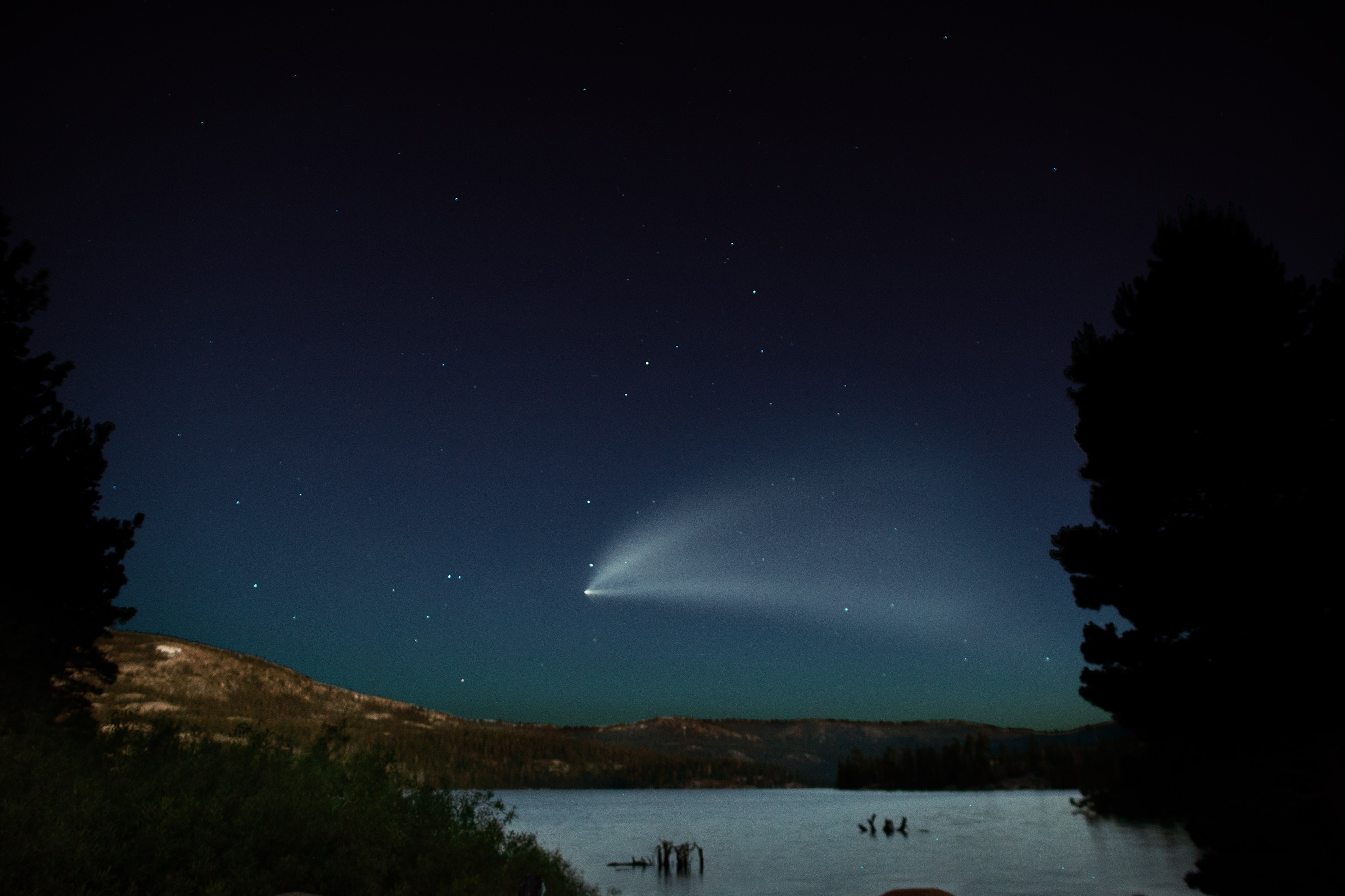 A four day road trip started with a bang when the night of July 19, with less than 200 miles driven so far, I decide to do a quick stop at Silver Lake to have a bite. I am literally sitting in the front seat of my truck overlooking the lake, when I notice this familiar shape in the sky right in front of me! Are you kidding me!!?? I quicky get out, grab my tripod, camera, didn’t even bother to check the lens, I shoot right away. 30 seconds later it was all a smudge. The trip couldn’t start any better, and it wasn’t fully dark yet! Indeed, there had been a rescheduled rocket launch at the Vandenberg Air Force in Southern California a few minutes earlier. Pretty amazing that I was able to see it, all the way up, just south of Lake Tahoe, hundreds of miles away, also with a bright crescent Moon lighting up the sky and the ground. A bit of googling reveals that this Falcon X is carrying several Starlink satellites into orbit.