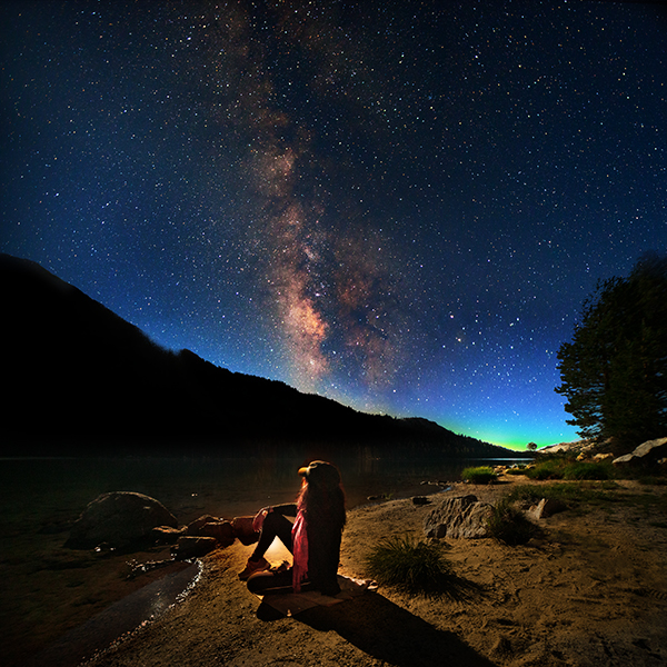 Woman sitting next to Tenaya Lake under the moonlight, Yosemite National Park, California