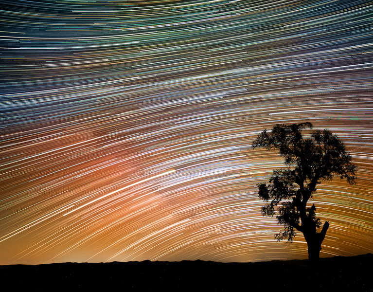 Star trails against an oak tree’s silhouette in San Benito County, California