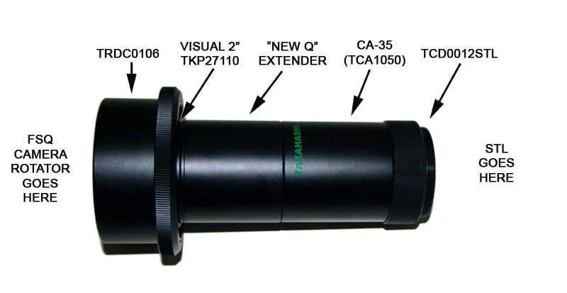 If you have a Takahashi FSQ106ED (or EDX) telescope with the camera rotator (CAA #17), and a SBIG STL camera, and would like to use the Extender Q, the combination of adapters you need can get a bit tricky. Below I explain in detail a combination that works very well for me.