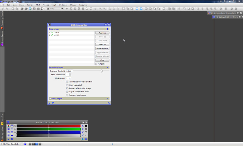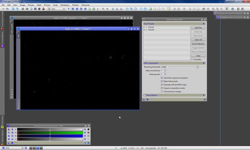 Now that we have our two master luminance images nicely aligned, let’s get to the bottom of it. HDRComposition works really well with linear images. In fact, if you feed it linear images, it will also return a linear image – a very useful feature, as you can create the HDR composition and then start processing the image as if the already composed HDR image is what came out of your calibration steps. The first step then, once we have our set of images with different exposures nicely registered (just two in this example), is to add them to the list of Input Images: