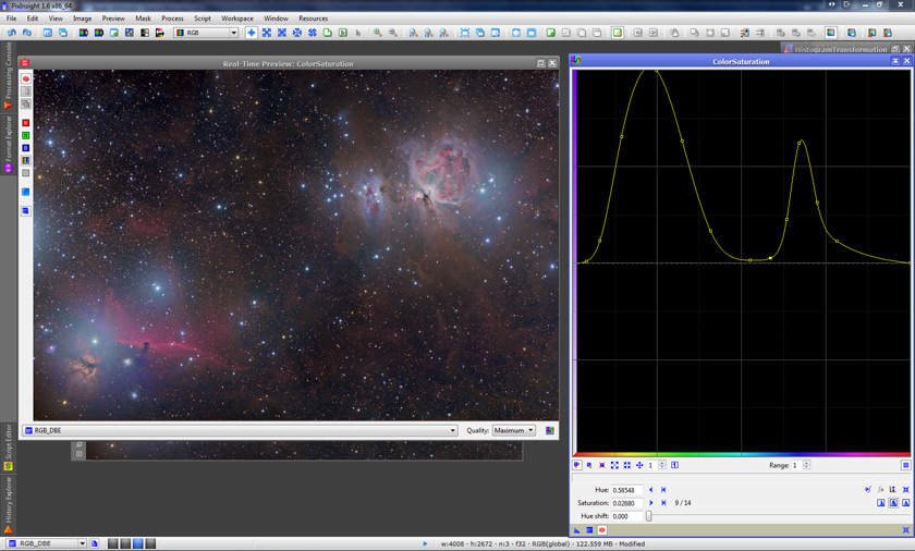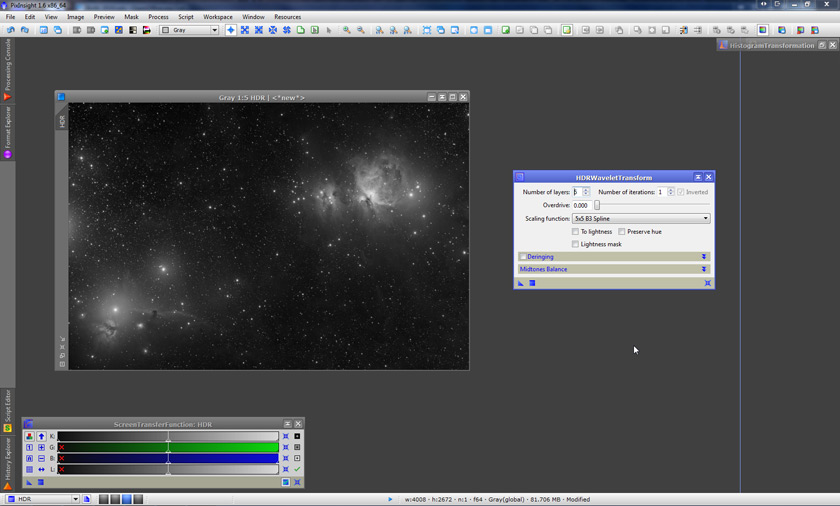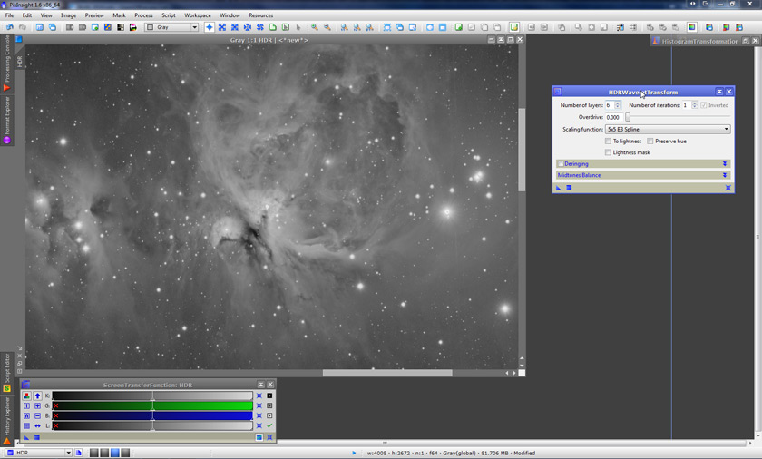 So, again using the default parameters but of the HDRWT tool instead (it just so happens that they work really well for this image), we apply it to the image. Now, the little details in the core of M42 finally become visible (don’t worry if it’s hard to see in the screenshot below, we’ll zoom in later):