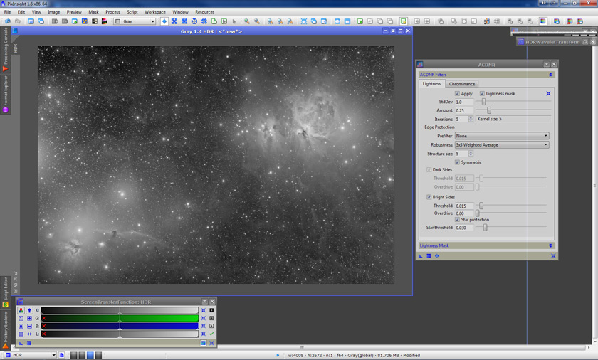 This is a good time to apply some noise reduction. We could have also done it earlier, before applying the last HDRWT. A quick noise analysis tells us that noise seems to be strong at small and very small scales, so we would apply the ACDNR tool first attacking the very small scale noise (StdDev value of 1.0), then a second pass to go for the rest, say with a StdDev value of 3.0, and then, why not, readjusting the histogram once again if we like.