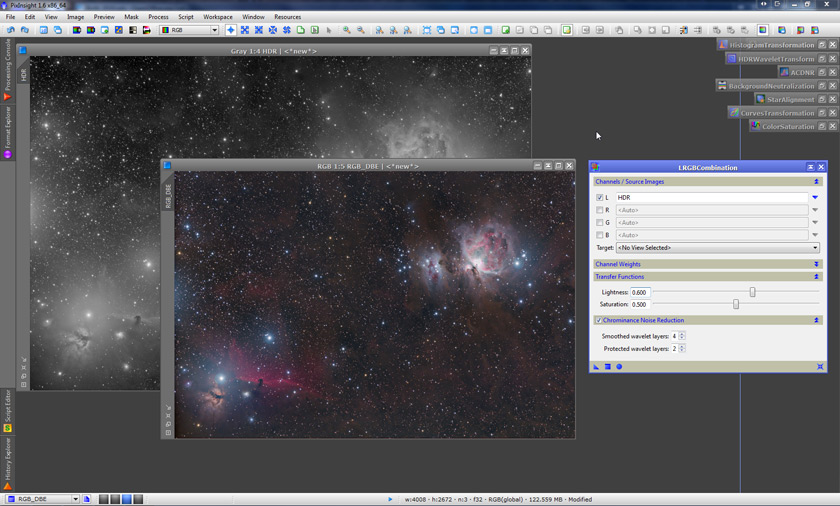 Although PixInsight offers a nice tool to adjust the lightness prior to integrate it with color data (LinearFit), in this case, the difference between both images is rather large, so I opted for skipping the LinearFit step, and manually adjust the Lightness parameter in the LRGBCombination tool. With that done and the LRGB already combined, I added a bit of a gradual saturation with the ColorSaturation tool: