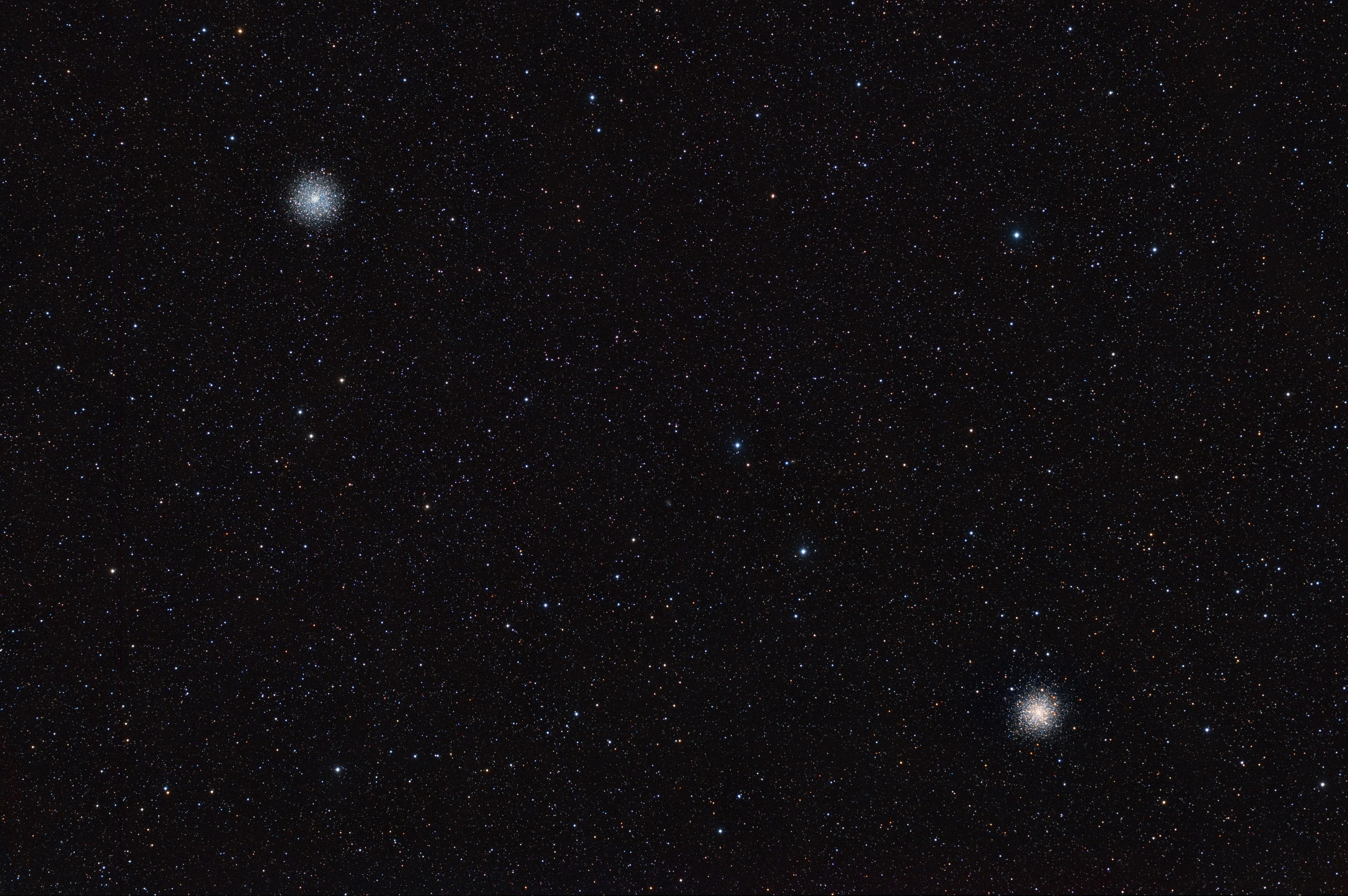 Now we can see what’s really there, and the most noticeable thing (besides a “bad column” that wasn’t corrected during calibration) is a gradient that presents our image rather bright on the left area, and much darker on the right. Our two globular clusters show nice and clear, which is nice.