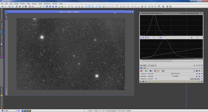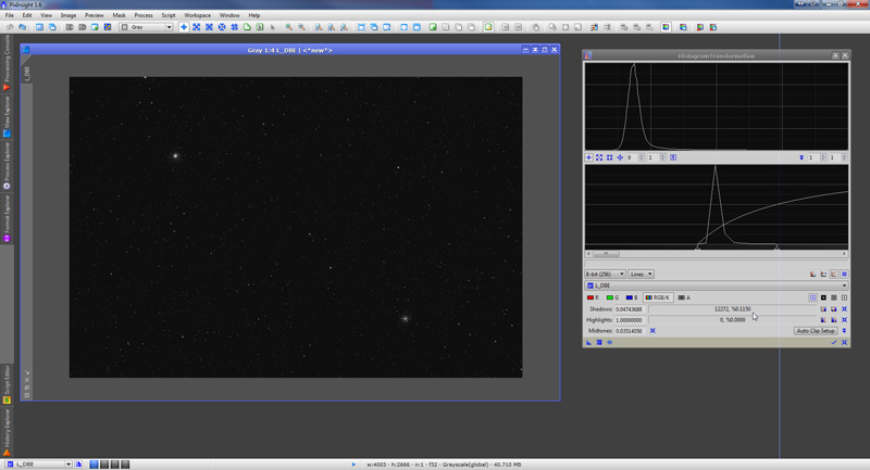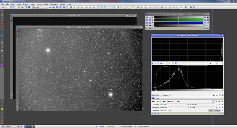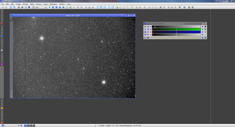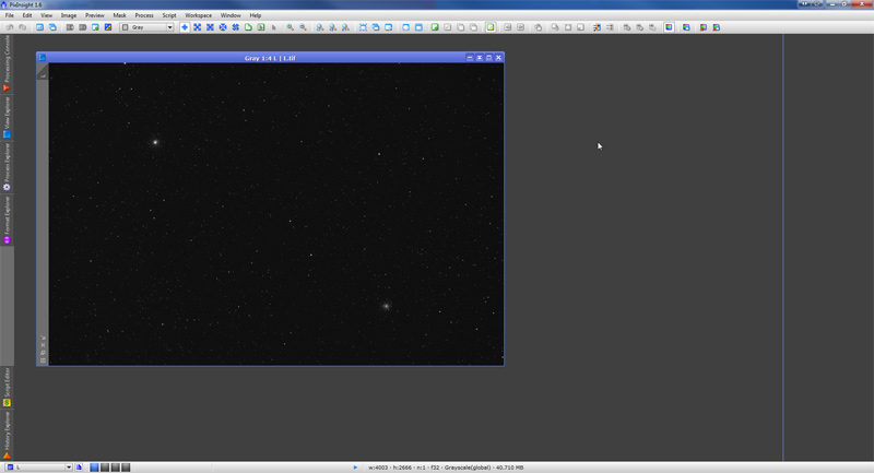 We skip the process of calibrating and registering the 7 subframes. This means we already have a “master” luminance file. We open it in PixInsight: